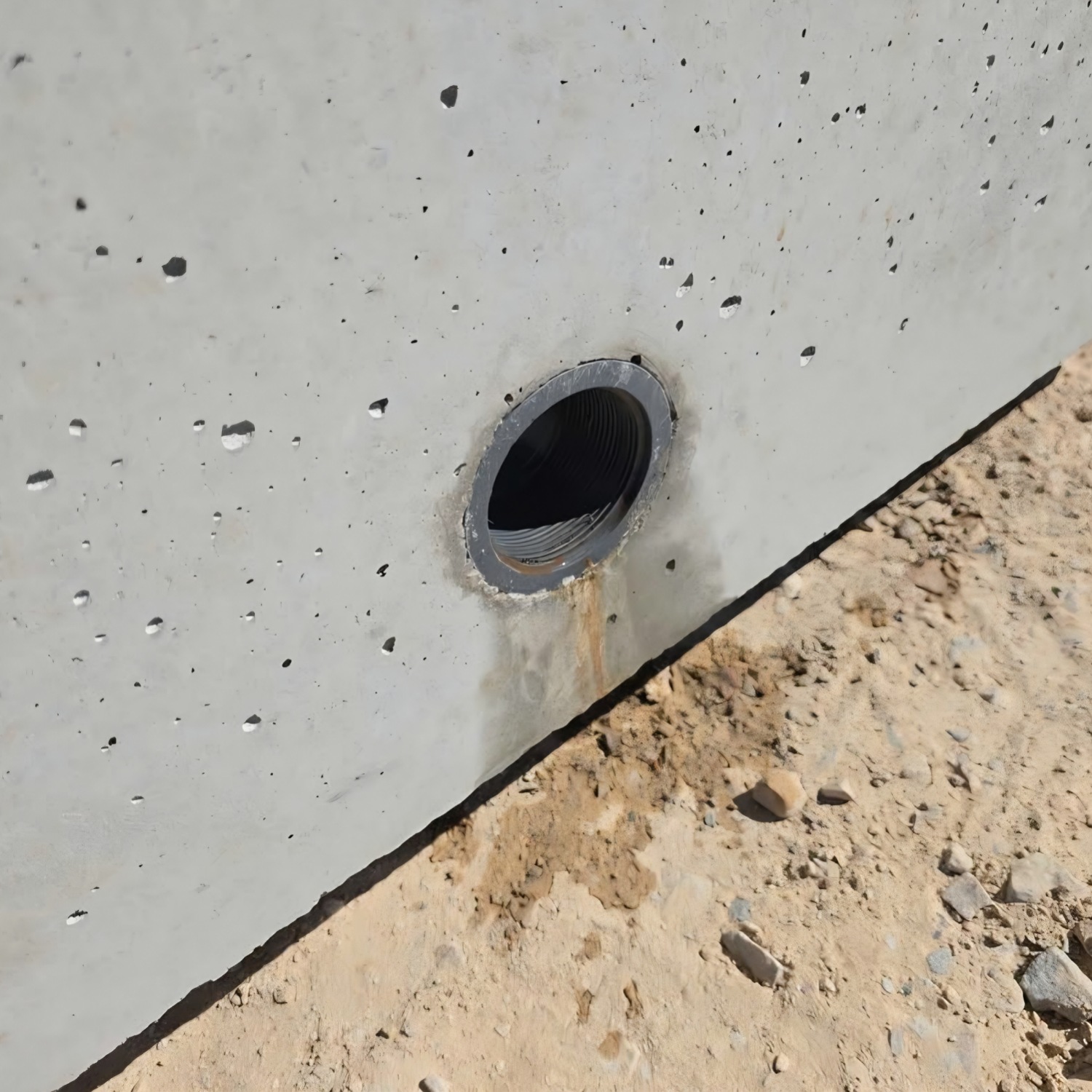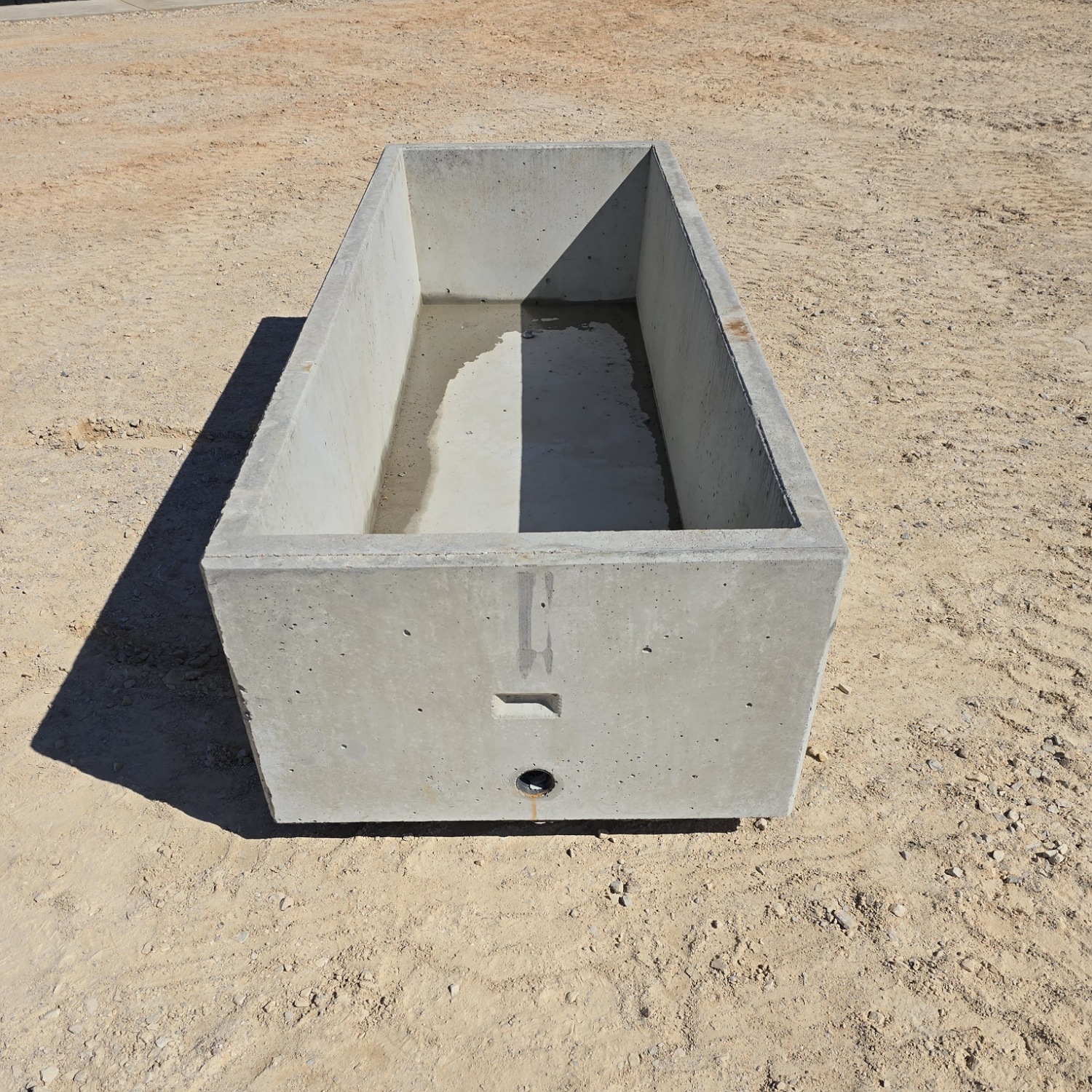 Heavy-duty concrete water trough with reinforced construction. Features bottom inlets and a side drain for easy water management.